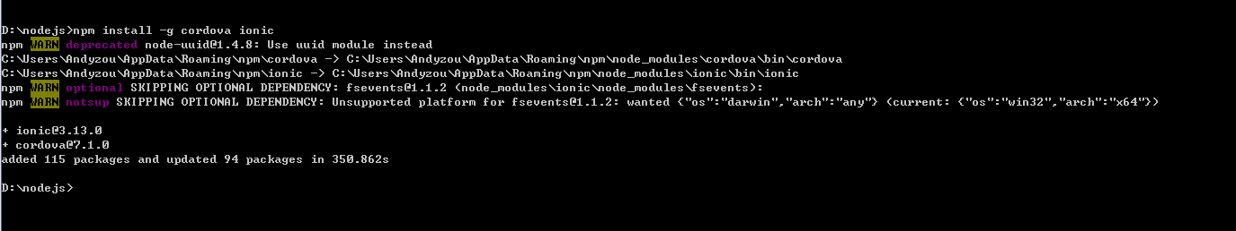 也可以安装cnpm,这样就容易装cordova和ionic